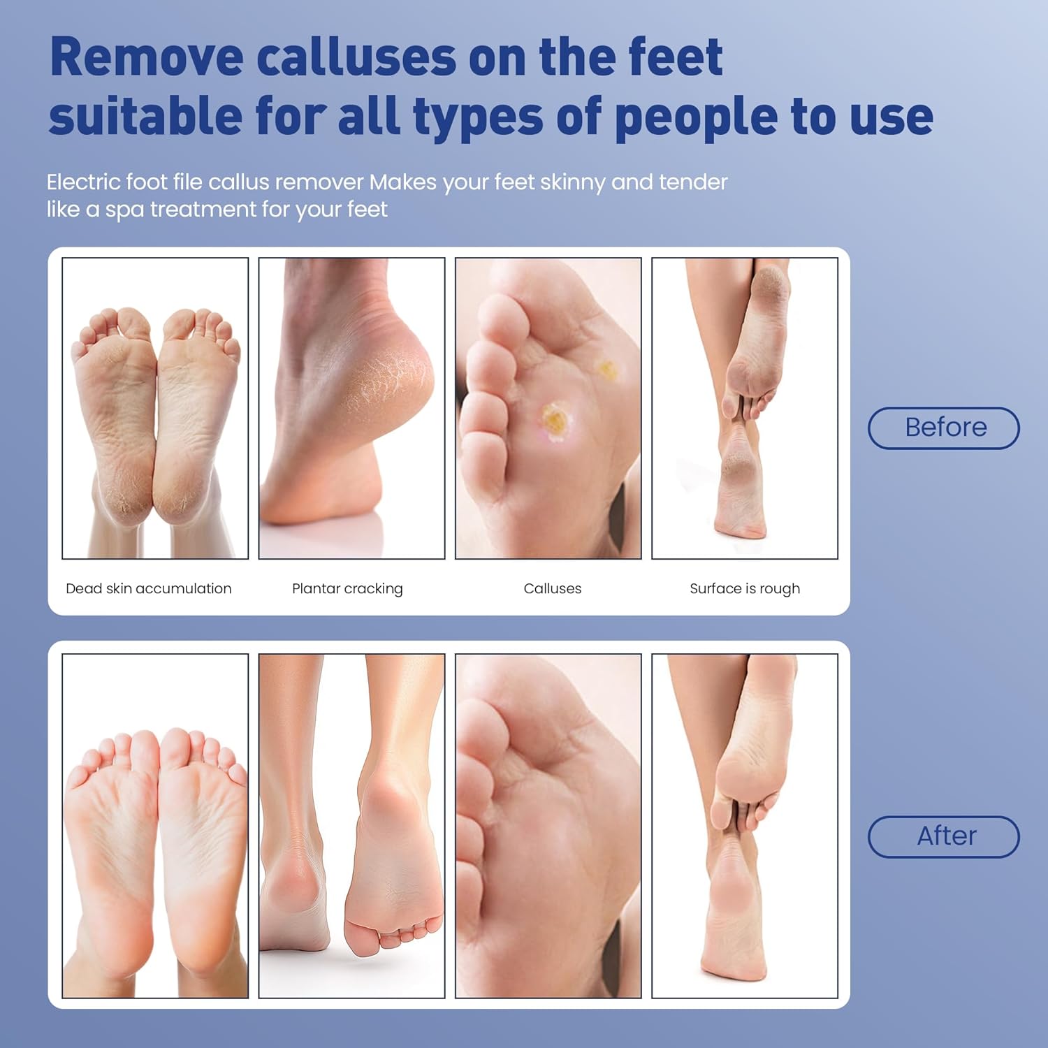 - [Easy to use and a must-have for families]: the electric foot callus remover can safely remove calluses and dead skin without damaging healthy skin. Practical and stylish, you can do foot hydrotherapy at home. After soaking or taking a foot bath, use a foot scraper to keep your feet soft and healthy. This bone removal and foot repair set is definitely the best product for removing dead skin, calluses, and manicures.