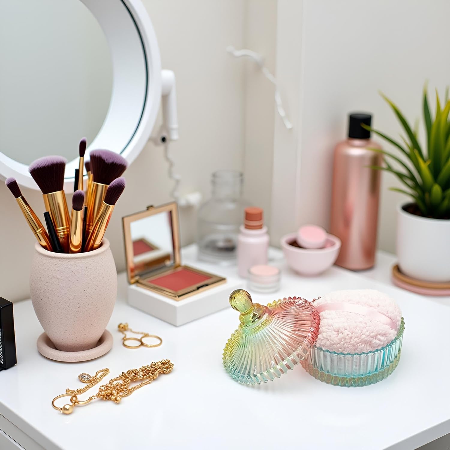 - 【Durable & Easy to Clean】 This glass powder puff container is made of high quality glass material, beautiful and durable. This product is not a sealed jar, which is easy to clean and take care of daily, it doesn't take up too much space, but can store your daily trinkets and keep your items organized