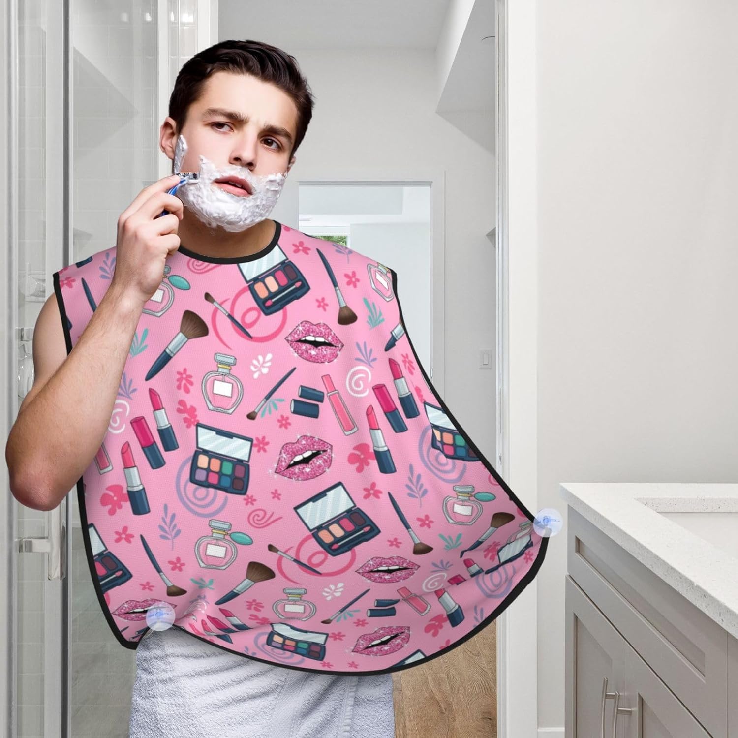 Non-Stick Beard Shaving Bib, Hair Catcher Apron with Suction Cups, Waterproof Grooming Tool for Men Husband, Modern Lady Girly Cosmetic Perfume Lipstick Pink Shave Bib
