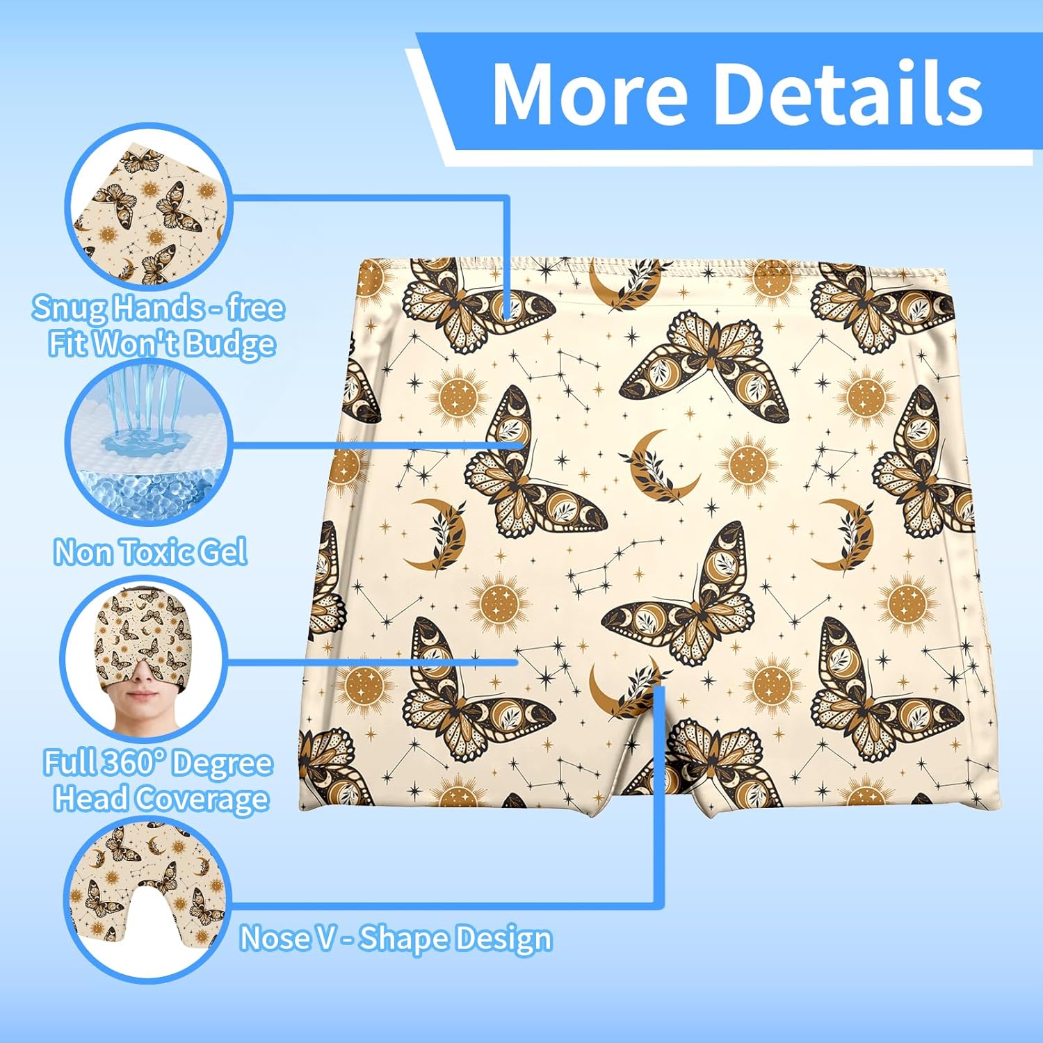 Migraine Relief Cap,Headache Relieve Cap,Beige Boho Butterfly Reusable Gel Ice Head Wrap Cap for Tension,Stress,Hangover & Puffy Eyes.