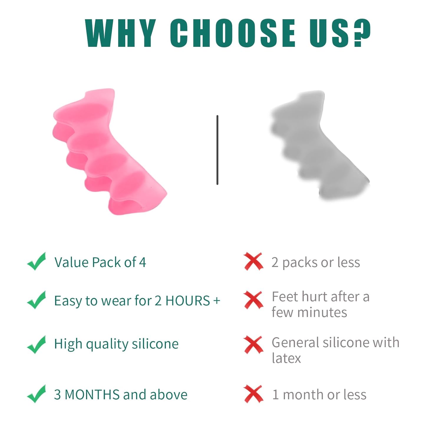 4 Pcs Silicone Toe Spacers โ Yoga Toe Separators for Toe Straightening & Relaxation | Correct Overlapping Toes, Bunions, Hammer Toe | Toe Support toe separators for Women & Men (Pink, 3.98)