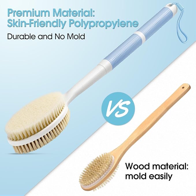 - 【Dual-Sided Bristles】The brush head has two sides: one with soft nylon bristles and the other with stiff natural bristles. Soft nylon bristles lather up well and can be used for areas like the arms, chest, and abdomen for bath brushing or gentle exfoliation.And the stiff side can be used for less sensitive areas like the legs and feet or dry brushing to exfoliate body.