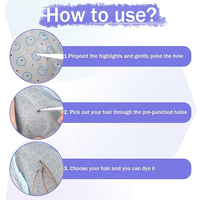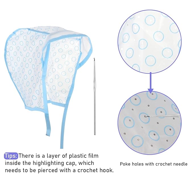 - 【Easy to Use】Put on the highlighting cap and tie the attached ties together at the neck for a secure fit, use the hook needle to poke through holes and pick out the hair that needs highlighting according to your preference, and then you can start your hair dyeing