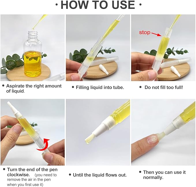 - Cuticle oil pen size: 12.5 x 1.2cm / 4.9 x 0.5inch. EASY TO USE: Fill easily with a pipette, cap the brush tip, and turn the brush tip clockwise to dispense liquid into the tip.
