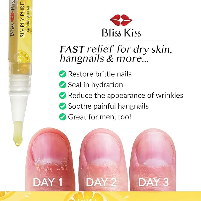 - Feeling Hopeless? If you’ve tried other nail strengtheners and nail growth treatments and been disappointed, you’ve finally come to the right place. Bliss Kiss nail and cuticle oil is hand-made with love and backed by nail science. No water. No dyes. No parabens. No preservatives. No mineral oil. No gluten. No almond oil. No fillers. No kidding. Each Simply Pure nail oil cuticle pen is hand-made with love in the USA since 2012. Remember, Bliss Kiss is best for instant relief & lasting success.