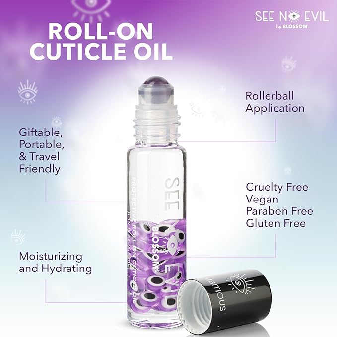 - ROLL-ON CUTICLE OIL: Blossom’s See No Evil Roll On Cuticle Oil is available in 4 positivity-inspired scents (Courage Rose, Intelligence Jasmine, Happiness Lily, and Ambitious Lavender) with matching colored evil eye charms