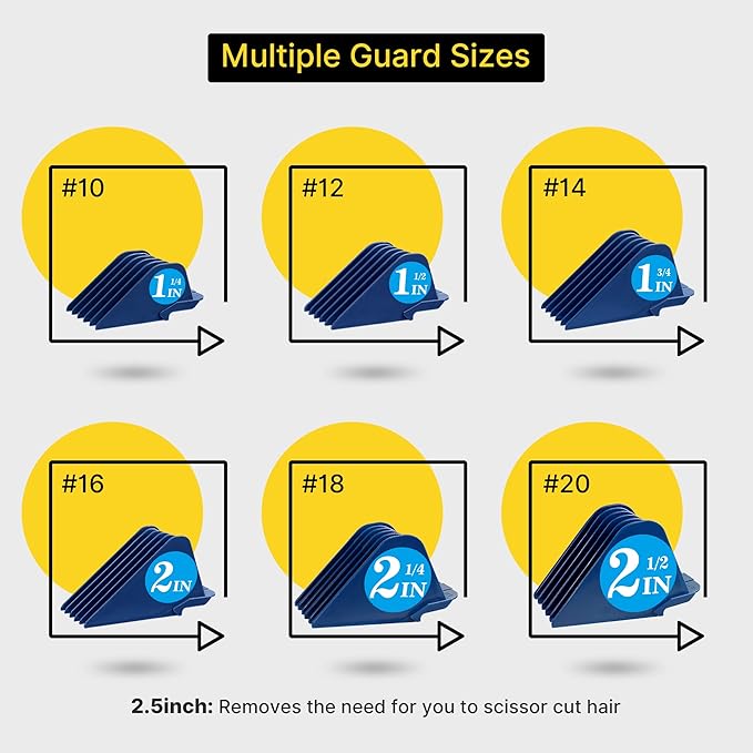 - Huge, Perfect for A Long Cut: Premium extra large clipper guard set includes 2.5 inch/64mm (#20), 2.25 inch/57mm (#18), 2 inch/51mm (#16), 1.75 inch/44mm (#14), 1.5 inch/38mm (#12), 1.25 inch/32mm (#10) combs. You 're able to keep the top of hair cut short, but not too short