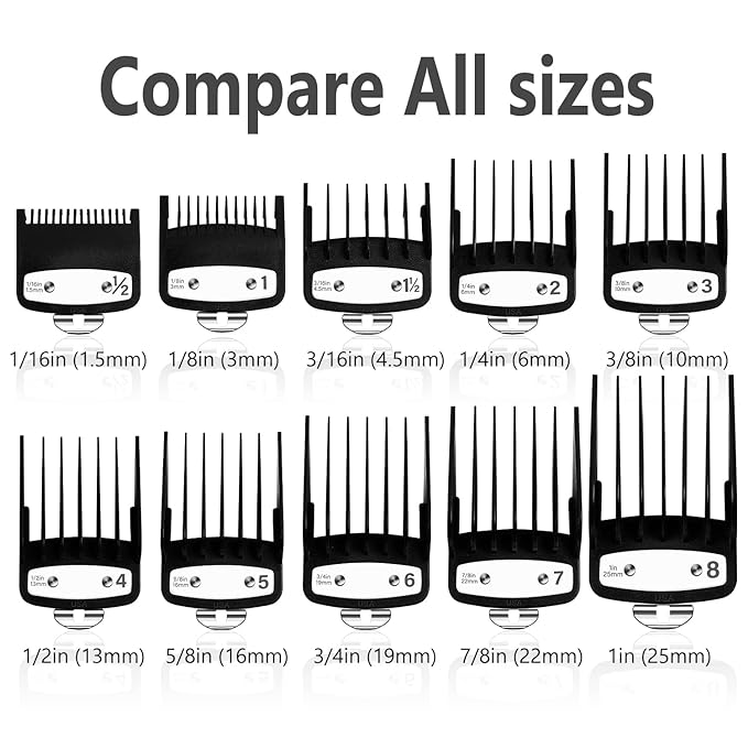 - 【Multiple Optional Sizes】Up to 10 different sizes of for wahl clips, you can freely choose the size you like, including 1/16", 1/8", 3/16", 1/4", 3/8", 1/2", 5/8", 3/4", 7/8" and 1". For wahl clipper code combs in different sizes allow you to cut hair in different lengths, giving you more hairstyle options for wahl trimmer guides.