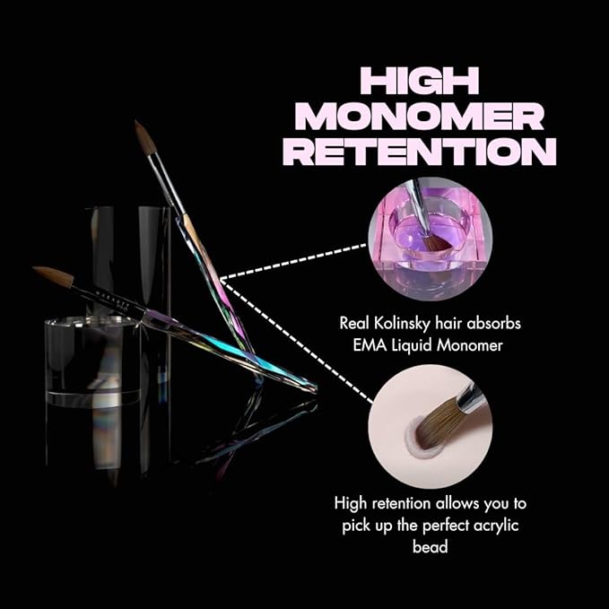 - Anti-Clogging Properties: Our professional acrylic brushes are made with pure kolinsky hair, which is necessary for keeping your nail brushes unclogged with acrylic.