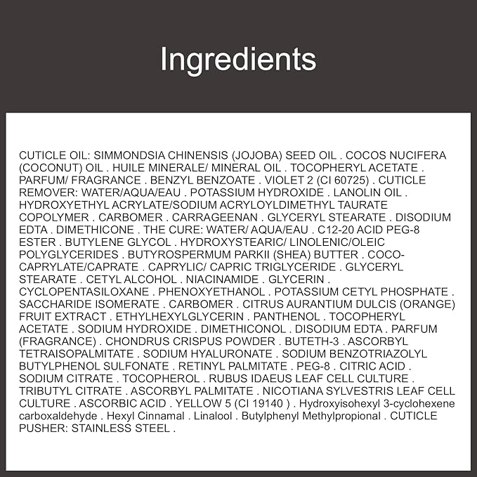 - CUTICLE CREAM AND PUSHER: The Cure, an ultra-nourishing cuticle repair cream, is packed with patented raspberry stem cell extract, red algae, shea butter, sodium hyaluronate, and vitamins A, C, & E, to instantly nourish, repair, and relieve dry cuticles