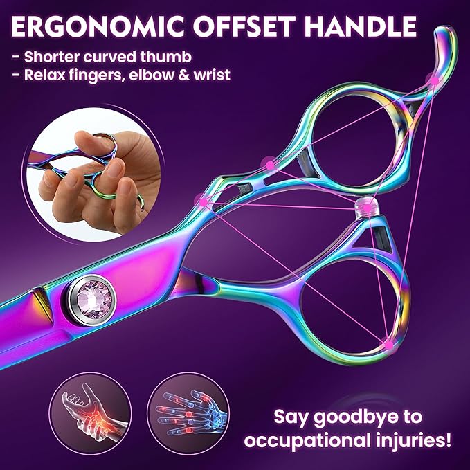 - ERGONOMIC & SAFE - The right-handed hair cutting scissors set is with ergonomic and safe design. The offset handle with a shorter curved thumb and a finger rest can relax fingers, wrist and elbow, help reduce the risk of occupational injuries. Blunt tips can protect the skin well. The High resilience muffler can reduce noise efficiently, make hairstylists and customers enjoy the process of modeling.
