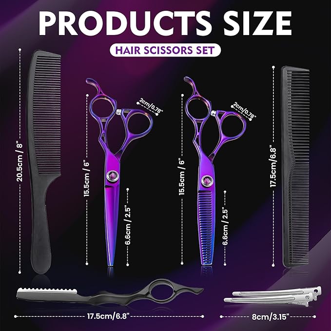- MULTIFUNCTIONAL - 6 inches Purple hair scissors with 2.5 inches cutting blades, the shears for hair cutting are suitable for stylists, salon workers, barbers Hairdressers and family to use on men, women, the elderly, children, babies and so on.