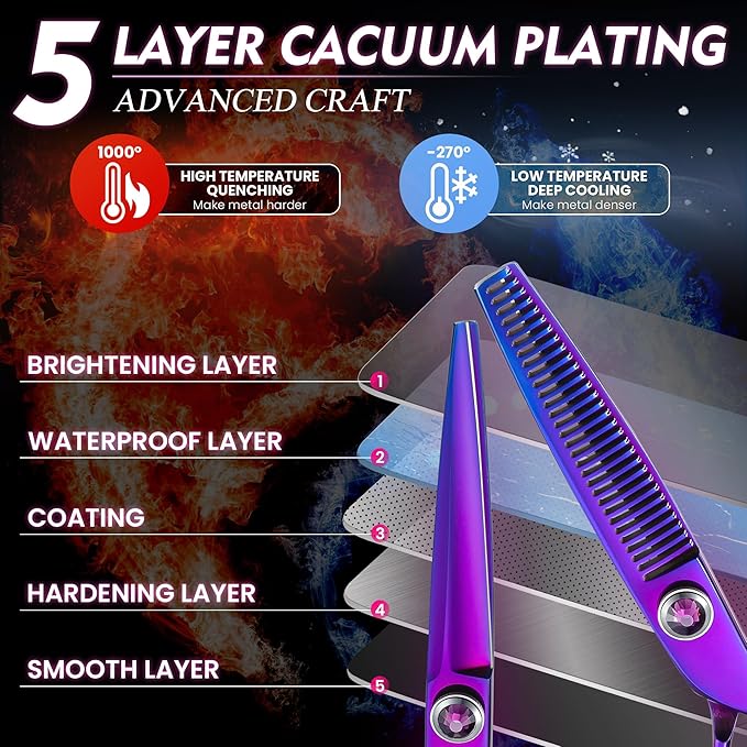 - ULTRA SHARP & DURABLE - The hair cutting shears set are made of premium Japanese 440C stainless steel. The super sharp blades with Convex edge, Hollow-ground are handmade by experienced craftsmen to ensure high sharpness and superior durability. The professional hair thinning shear is with 30 teeth and gives 20-25% thinning rate, it can thinning hair effortlessly without leaving marks or damaging hair.