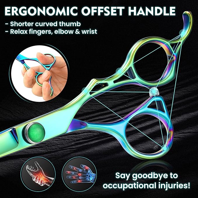 - ERGONOMIC & SAFE - The right-handed hair cutting scissors set is with ergonomic and safe design. The offset handle with a shorter curved thumb and a finger rest can relax fingers, wrist and elbow, help reduce the risk of occupational injuries. Blunt tips can protect the skin well. The High resilience muffler can reduce noise efficiently, make hairstylists and customers enjoy the process of modeling.