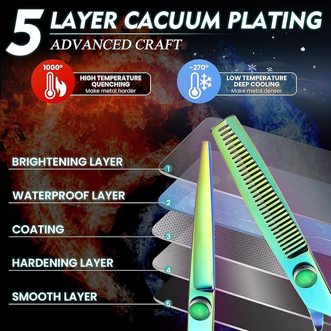 - ULTRA SHARP & DURABLE - The hair cutting shears set are made of premium Japanese 440C stainless steel. The super sharp blades with Convex edge, Hollow-ground are handmade by experienced craftsmen to ensure high sharpness and superior durability. The professional hair thinning shear is with 30 teeth and gives 20-25% thinning rate, it can thinning hair effortlessly without leaving marks or damaging hair.