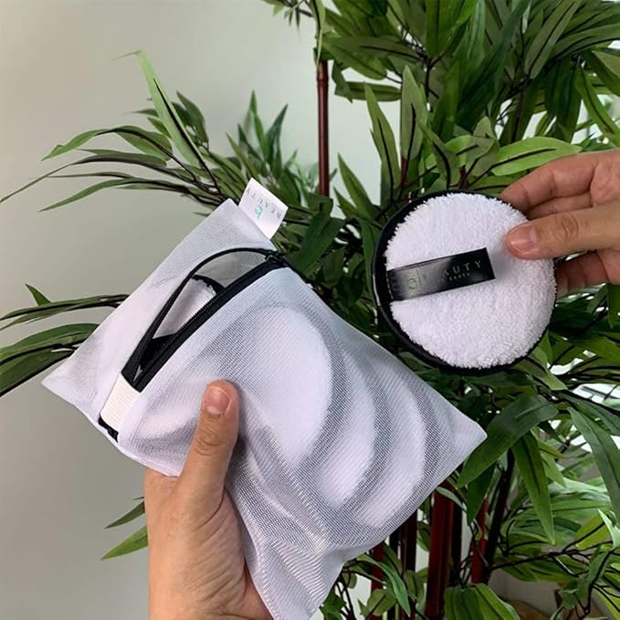 These ultra-soft microfiber pads are gentle on the skin and effectively remove all types of makeup, including eye makeup. The kit includes 5 large round pads and a zippered laundry bag for convenient storage and cleaning. Say goodbye to single-use cotton pads and switch to our reusable makeup remover pads.