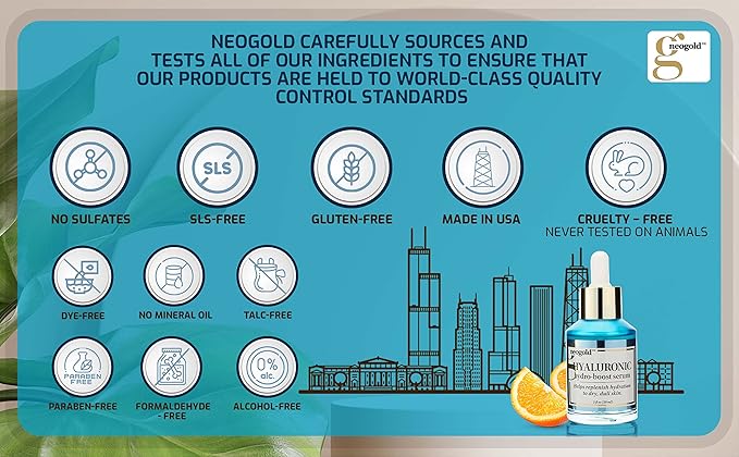 - HYDRATE & RESTORE – Dermatologist-Tested, Clinically-Tested, & Allergy-Tested Formula. Manufactured in our FDA-Regulated & Inspected Laboratory in Chicago, USA. If for any reason you decide this Neogold Hyaluronic Acid Serum isn't a fit for your skin, we're here for you. Each purposefully balanced medley of key antioxidants, super-nutrients, & nourishing botanical actives enhance efficacy & delivers long lasting skin-friendly benefits, without harmful additives or fragrances.