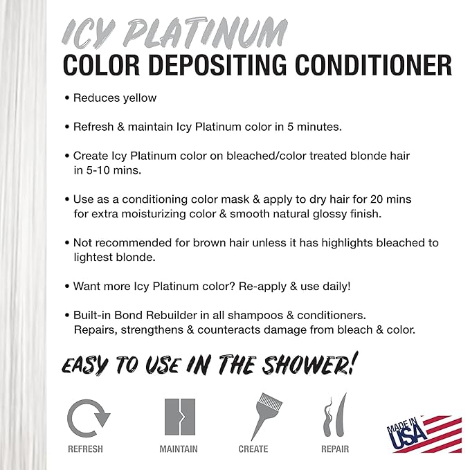- Icy Platinum Hair Dye, color depositing shampoo and conditioner. Use to maintain silver color treated hair. Creates silver on bleached hair and bleached highlights. Great to get rid of unwanted yellow, on blonde and natural gray. If there is a lot of yellow in the hair, it will reduce yellow first before you get to silver. Easy to use silver dye applied with the ease of shampooing and conditioning your hair. Not recommended for dark blonde or brown hair.