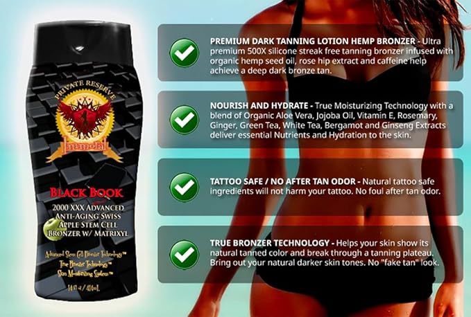 - PREMIUM DARK TANNING LOTION ANTI AGING BRONZER - Ultra premium streak free tanning bronzer infused with green apple stem cells, matrixyl, organic hemp seed oil, rose hip extract and caffeine help achieve a deep dark bronze tan. Premium streak free tanning lotion formula helps accelerate your skins natural tanning bronzing process while bringing out your own natural skin tones. Helps you break through a tanning plateau.