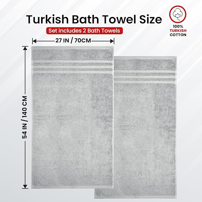- SET OF 2 BATH TOWELS - The set contains 2 premium Turkish bathroom towels measuring 27 by 54 inches each. These are truly luxurious towels come in a variety of beautiful colors to complement with any home, dorm or hotel bathroom.