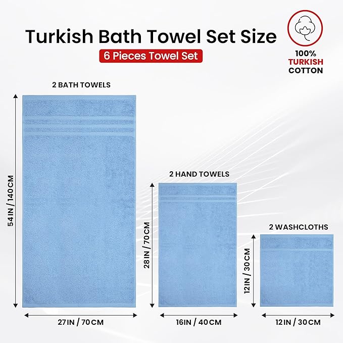 - SET OF 6 - Our luxury set of towels contains: 2 bath towels measuring 27 x 54 inches each; 2 hand towels of 16 by 28 inches each; and 2 washcloths of 12 inch by 12 inches each Enjoy a spa like experience with our luxuriously soft and absorbent towel set.
