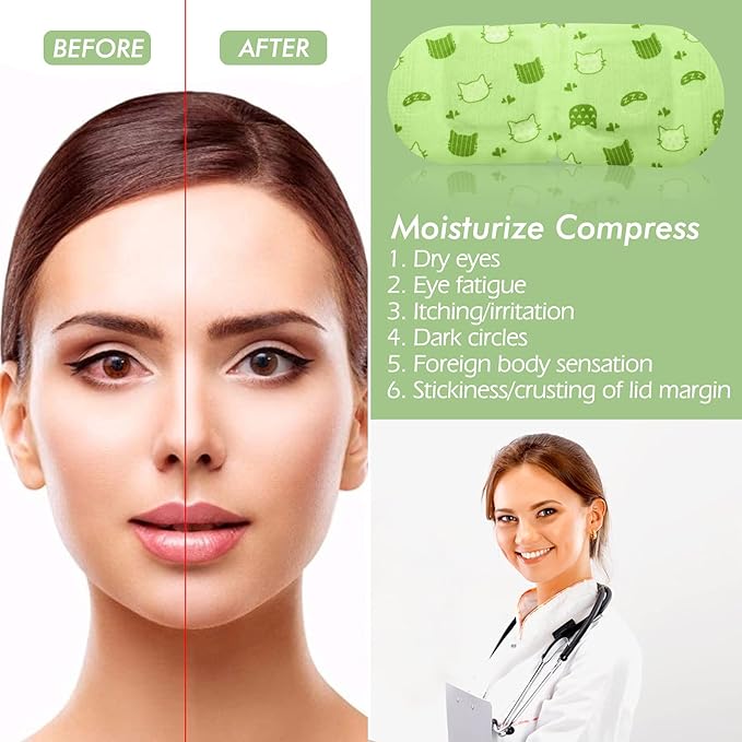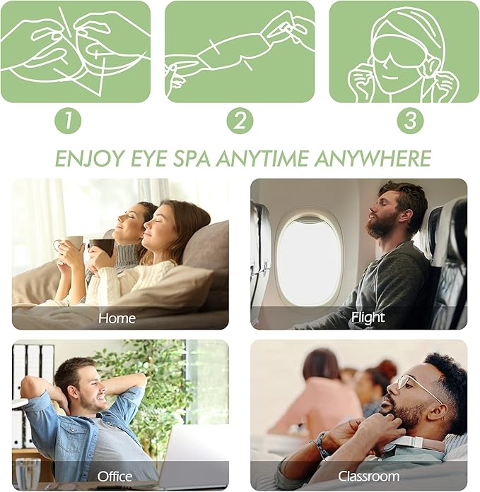 - Steam Eye Mask: Tired, dehydrated, jet-lagged, or had too much salt at dinner the night before? Our heated eye masks with a self-heating design, act as a convenient solution to tired, stressed-out eyes, dry eyes, and eye fatigue, moisturize your eyes, improve your sleep quality, and reduce dry puffy eyes and dark circles. Our dark circles under eye treatment for women make your eyes brighten while enjoying these disposable eye patches for adults