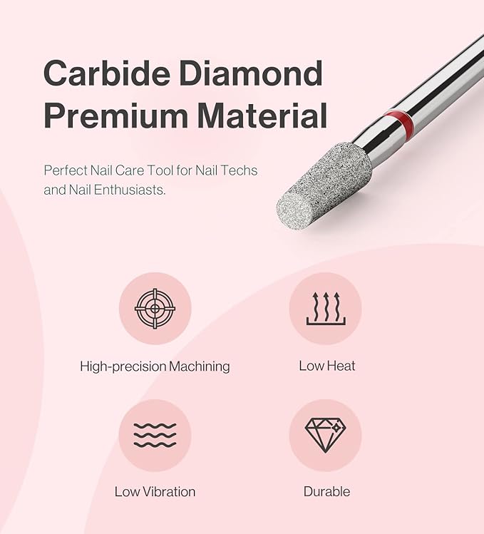 - Professional Carbide Diamond Nail Drill Bit: Made of premium strength carbide diamond material, this high precision machining nail bit comes with excellent heat dissipation, low vibration, low noise, and hard-wearing features. Perfect nail care tool for nail techs and nail enthusiasts.