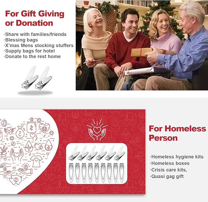 - For Gifts or Donation:You can use these fingernail & toenail clippers as gifts,bulk mens gifts wholesale,or donation such as the homeless hygiene kits,for homeless supplies bulk,homeless boxes,blessing bags,crisis care kits, or other events such as mens stocking stuffers,quasi gag gift,operationchristmas child gift shoeboxes,supply bags for hotel,etc