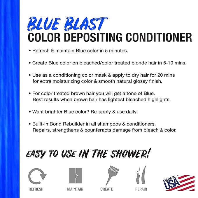- Blue Hair Dye, color depositing shampoo and conditioner. Use to maintain blue color treated hair. Creates bright blue on bleached hair and bleached highlights. Easy to use blue dye applied with the ease of shampooing and conditioning your hair. Less vibrant results on brown color treated hair and not recommended for non-color treated or gray hair.