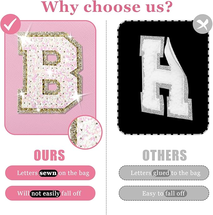 • 【Personalized Letter Design】Personalized initial letter makeup bag is designed with stitched glitter sequin letters, you don't have to worry about it falling off. Unique glitter 26 letters design, the shiny gold border and glitter sequin letters shimmer charmingly, the cute flower bet lettering patches have a strong personalized style, making your makeup bag the center of attention.