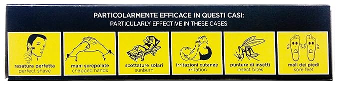 - Particularly effective in case of perfect shave, chapped hands, sunburn, skin irritation, insect bites and sore feet