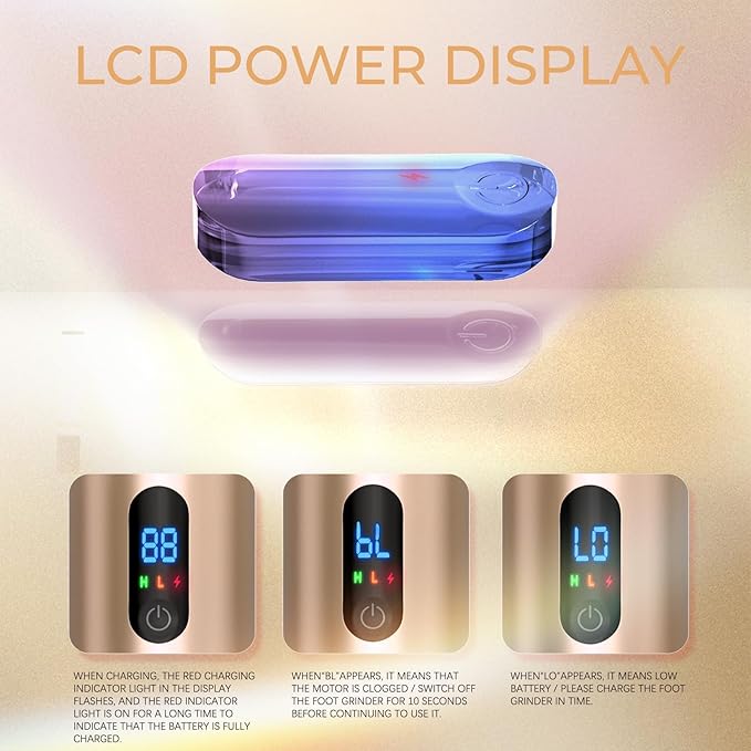 - 【Rechargeable&No Plug】The rechargeable electric feet callus remover has a Type-C charging port, and it takes about 4 hours to be fully-charged. There is a LCD display on the electric callus remover, showing you the battery level 0-99% and the speed mode you're using. When the battery shows"L0", you need to have it charged. What's more, this foot scrubber electric has no plug, very convenient to carry with you, good choice for long trip!