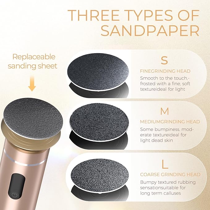 - 【60 Sandpaper Discs】Our electric feet callus remover for feet is equippied with 3 types of sandpaper discs: fine, medium and coarse sand, 20pcs each. These sandpaper discs are made of safe material that won't hurt your skin. There is adhesive on the back of sandpaper discs, you just need to stick it on the grinding pad then you can start using the electric foot filer. Our rechargeable electric foot file provides you with more options.