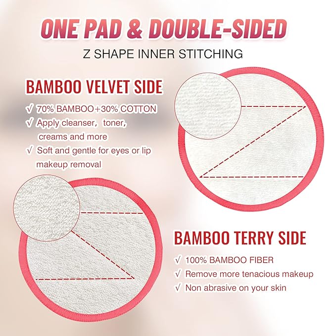 - Double-sided & Non-slip Design - Our reusable cotton rounds include a bamboo terry side for removing tenacious makeup and a bamboo velvet side for delicate areas such as eyes or lip. Each makeup remover pad is stitched together to prevent slipping and dragging against your skin.