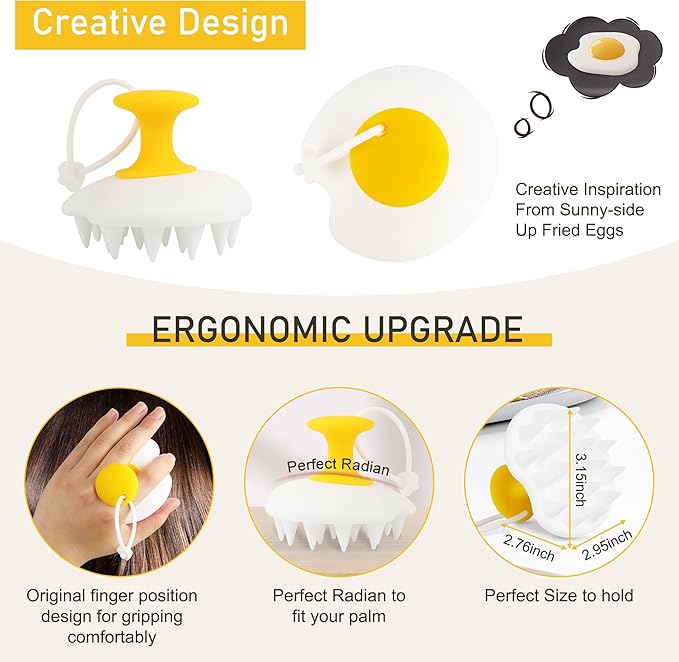 - ❁【Inspired By Sunny-Side Up Fried Eggs + Unique Finger Position Design】 Hair Scalp Massager Boasts A Unique And Creative Design, Drawing Inspiration From Sunny-Side Up Fied Eggs. Hair Massager's Upgraded Size And Ergonomic Design Ensure Maximum Comfort. With A Special Finger Position Design, Massager Stands Out For Its Uniqueness.