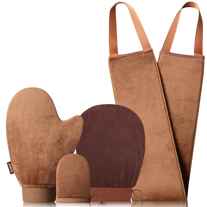 - 【4-in-1 Luxury Pro Self Tanning Mitt】You deserve the BEST! Treat yourself to the BEST self tanning mitt applicator, get a real flawlessly sun-kissed skin, and finish by yourself without asking others for help. This self tan mitt set includes 1x tanning glove, 1x back applicator, 1x mini mitt for detail tan(such as fingers and toes, etc), 1x exfoliating mitt, which ensure you use self tanning mitt separately for each part of the body, MORE clean and safe.