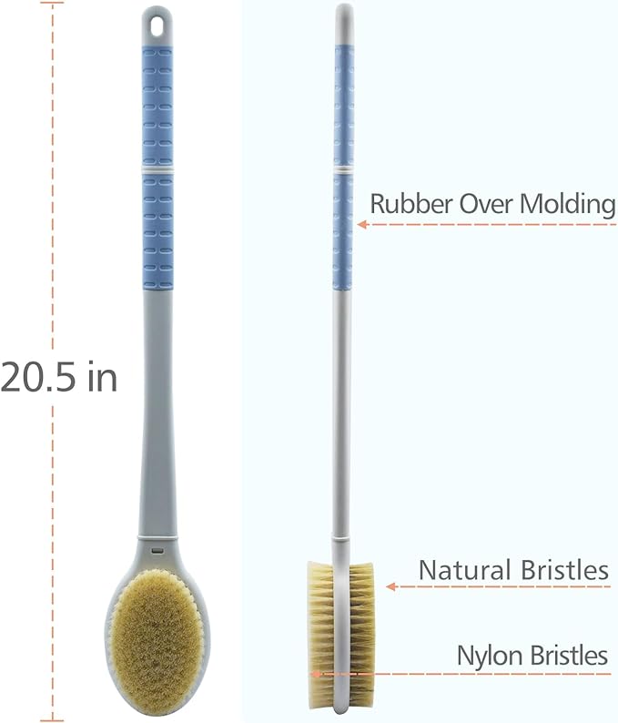 - LONG HANDLE BACK BRUSH - 20.5 inch Long Handle to Srub all those Hard to Reach Places,such as the Back and the Feet.There is also a little shorter Long 17.5 inch Brush in the Listing,Please Choose which one Better for you.And the Handle with Rubber Over Molding,so,it's Easy to Hold in your Hand.