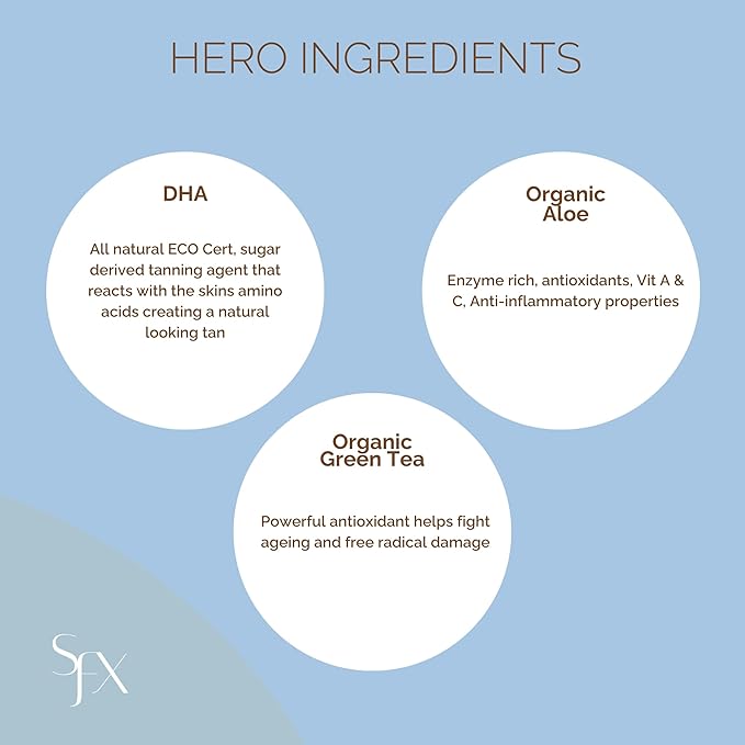 - SKIN LOVING INGREDIENTS THAT EXTEND YOUR TAN: Using Organic Aloe Vit A, C and E to promote deeper absorption and skin hydration. This ensures better skin uptake of the active tanning ingredient DHA and increased tan longevity. Tans typically last 7-10 days with proper care and application