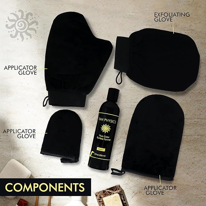- Complete 6-Piece Set for Perfect Application:Includes (1) 8 oz Tan Physics Sunless Tanner, (3) premium application gloves for an even spread, (1) exfoliating glove to prep your skin, and (1) stylish bag for convenient storage and travel.
