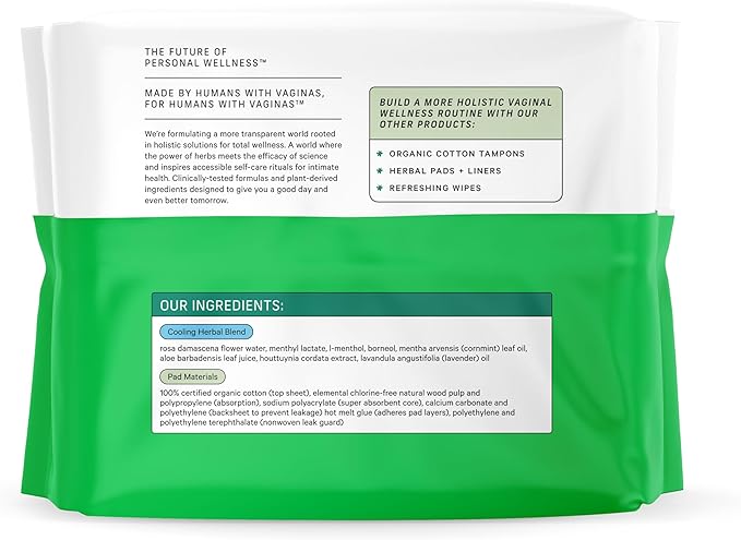 - We created our community favorite herbal pads with supreme absorbency and cooling sensations to ensure you are secure and protected throughout your cycle, even on the heaviest of days