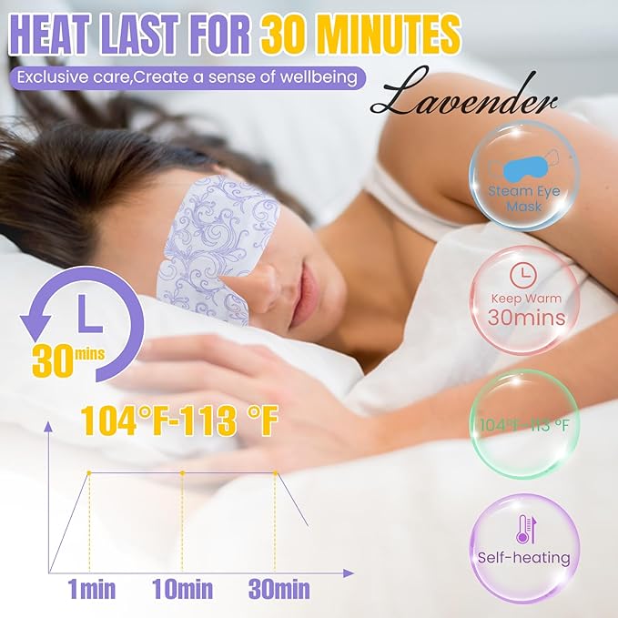 - 【Constant temperature and comfort 】Self Heating Moist Heated Eye Masks is made of upgraded cotton non-woven fabric, which is breathable, soft and comfortable to wear, skin friendly, and low sensitivity. The temperature ranges from 104 ℉ to 113 ℉ and can maintain warmth for approximately 30 minutes. When using a hot compress eye mask, you can feel your eyes warmer and more comfortable, helping you fall asleep quickly.